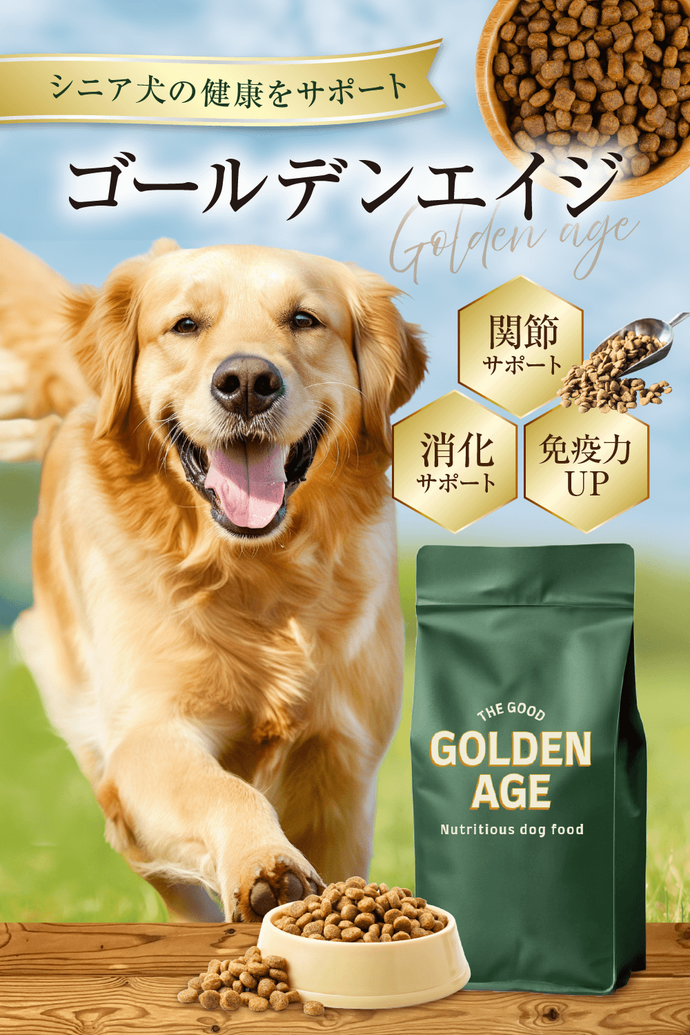 ネット上の練習課題として、シニア犬の健康をサポートするドッグフード「ゴールデンエイジ」のバナーを制作しました。飼い主が求める「愛犬の健康」と「安心感」を強く訴求し、製品の具体的なサポート内容を明確に伝えることを目的としています。